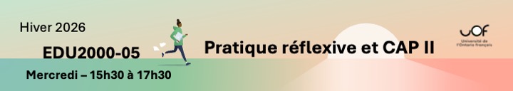 EDU2000-H26-05 - Pratique réflexive et communauté de pratique II - Stage II 📆 Mercredi 🕐 15:30 📆 Jeudi 🕐 8:00 📆 Vendredi 🕐 8:00 🏫 (4 crédits)
